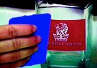 Finish your piece by blasting the number 3 areas with a light frost. Remove your glass from the cabinet and check to see that you have completely blasted each area without leaving any areas unfinished. Strip away the tape and the masking, and rinse under warm water. Dry your glass piece with a soft cotton towel. Do not use paper towels, as they will scratch your glass or crystal piece. Take special care during clean up when working with lead crystal, due to the fact that it is much softer than glass and will scratch easier.