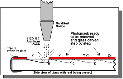 After you have completed all of stage one, it is now time to move onto to the next stages of your blast. Refer to the pull chart, to see which pieces to pull first. Using an Xactoโข knife, peel off all of the masking that is labeled with a number 2. You will notice that some of the pulls in the number 2 areas are shaded. This tells you that you need to go deeper in those areas. Concentrate your nozzle in that area, moving in small circular motions, begin to carve out that part of the design. This will give you a three dimensional effect on the rose pedals. Before you start to do the leaves, take a look at the diagram. Notice how the nozzle is pointed and is cutting deeper at B. The carving is away from the end of the last blast. This will give you a layered effect. Do the same for 2a-2g. Remember not to allow much blasting over the area that you just carved, always cutting away in circular motions.