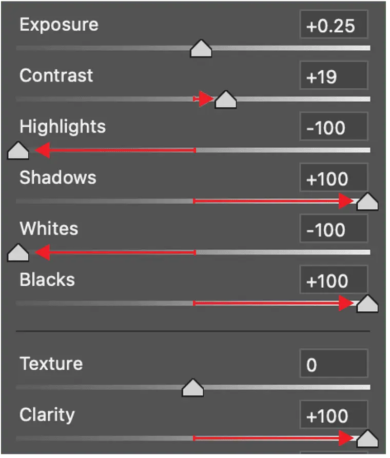 When you do the settings below you will end up “messing up” the photo that is intentional to bring contrast out.