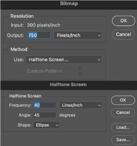 - Output: 750 / Halftone Screen / Click Ok /