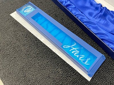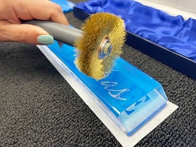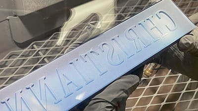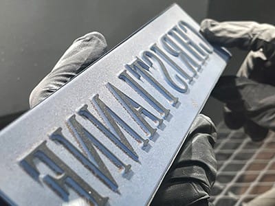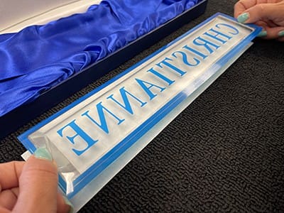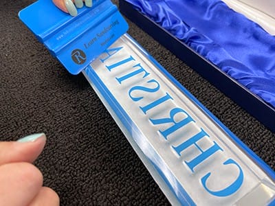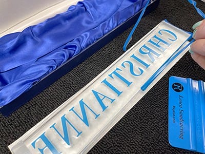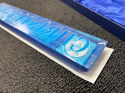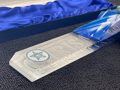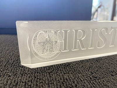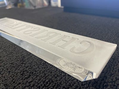 Our negative image will be etched into the nameplate. The nameplate is optic crystal, and the etching will occur on the back to magnify the sandcarving. Optic crystal was used to provide the brightest appearance.