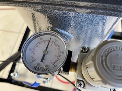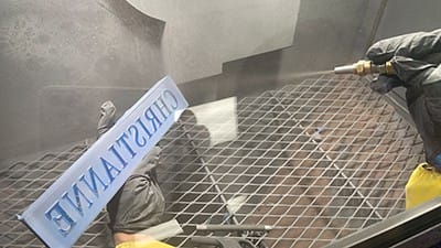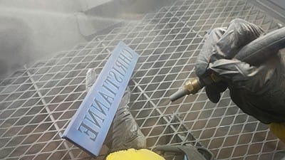 I used aluminum oxide 150 grit to achieve depth with the blasting pressure set at 50 psi (FIGURE 13). Aluminum oxide or silicon carbide could be used in 120–150 grit. If I had used 120 grit abrasive, I’d have set my blasting pressure at 35–40 psi.