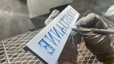 I applied vinyl blast tape to surfaces that were exposed but should not be blasted. The ready-to-blast nameplate’s front and back are shown in FIGURE 9 and FIGURE 10, respectively.