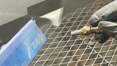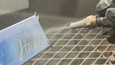 Nozzle control is important, especially on a negative design, to maintain an even etch. Move the nozzle slowly, keeping 4–5 in. from substrate (FIGURE 11). Eventually the photoresist will start to turn a light gray color (FIGURE 12) and darken as depth is achieved in the glass.