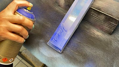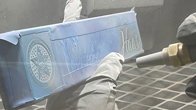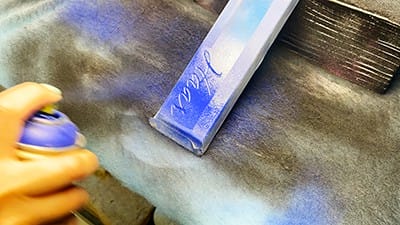 After sandcarving, use an air gun to remove any dust and debris from the etched area. In a well-ventilated area or paint booth, use spray paint or hand paint in the etched area. Shake the spray paint well and test spray prior to painting the project.