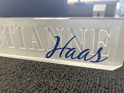 For this project, I took a simple nameplate and added value with a negative design, deep etching, frosting, and paint to create a unique gift. The first name fit perfectly on the back of the glass with a bold font and the last name was etched on the front, completed with the employee’s state seal.