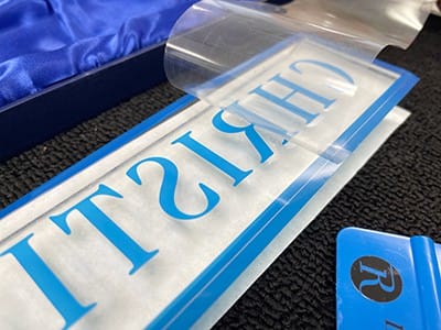 For the last name on the front of the artwork, I also used a 5-mil photoresist stencil, but I didn’t need a border since it isn’t a negative image.