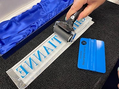 Once the last name and state seal stencil were placed, a squeegee (FIGURE 7) and wire wheel brush (FIGURE 8) were used to secure the stencils to the surface.