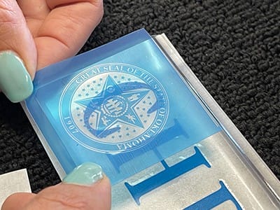For the state seal (FIGURE 6), I used SR3000™ 3Mil Self-Stick film. This thinner film allows me to capture the detail in the design but is still thick enough to get sufficient carving depth to add a color fill.