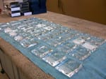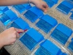 - Remove each crystal piece from the box and place it, etched side up, on the sheets of tape. Make sure you lay out all of your blanks and space them evenly apart. In doing so, you can complete the taping more efficiently.