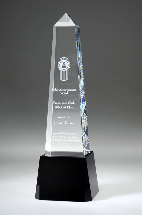 Elegant optic crystal trophy in the shape of a tapered obelisk. This blank award comes in a sophisticated presentation box, ready for personalized engraving. The premium crystal material captures and refracts light brilliantly, creating a prestigious recognition piece perfect for commemorating significant achievements.