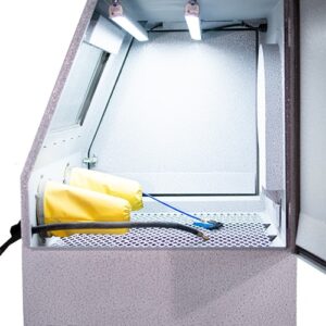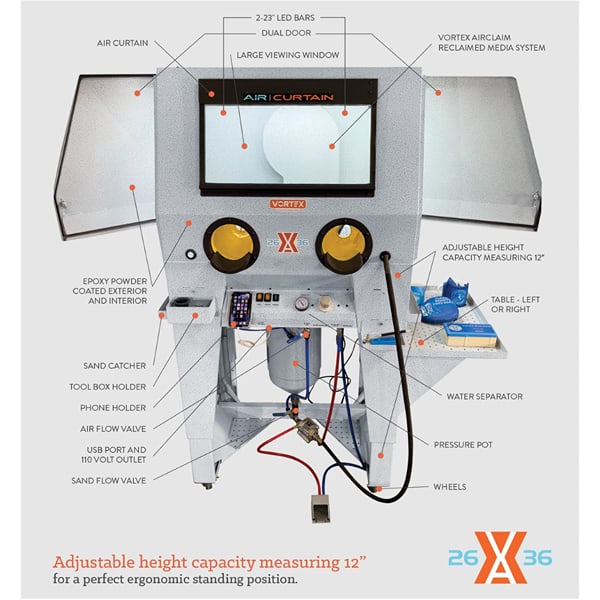 The cabinet workspace is deep and wide (inside work area 26”x36”) with bright balanced LED lighting. These are automatic refill pressurized systems with adjustable height capability measuring 12” of height adjustment for a perfect ergonomic standing position. Every detail of the 2636VXA Sandcarving System was designed with the etcher in mind, making the experience productive, efficient, and convenient.