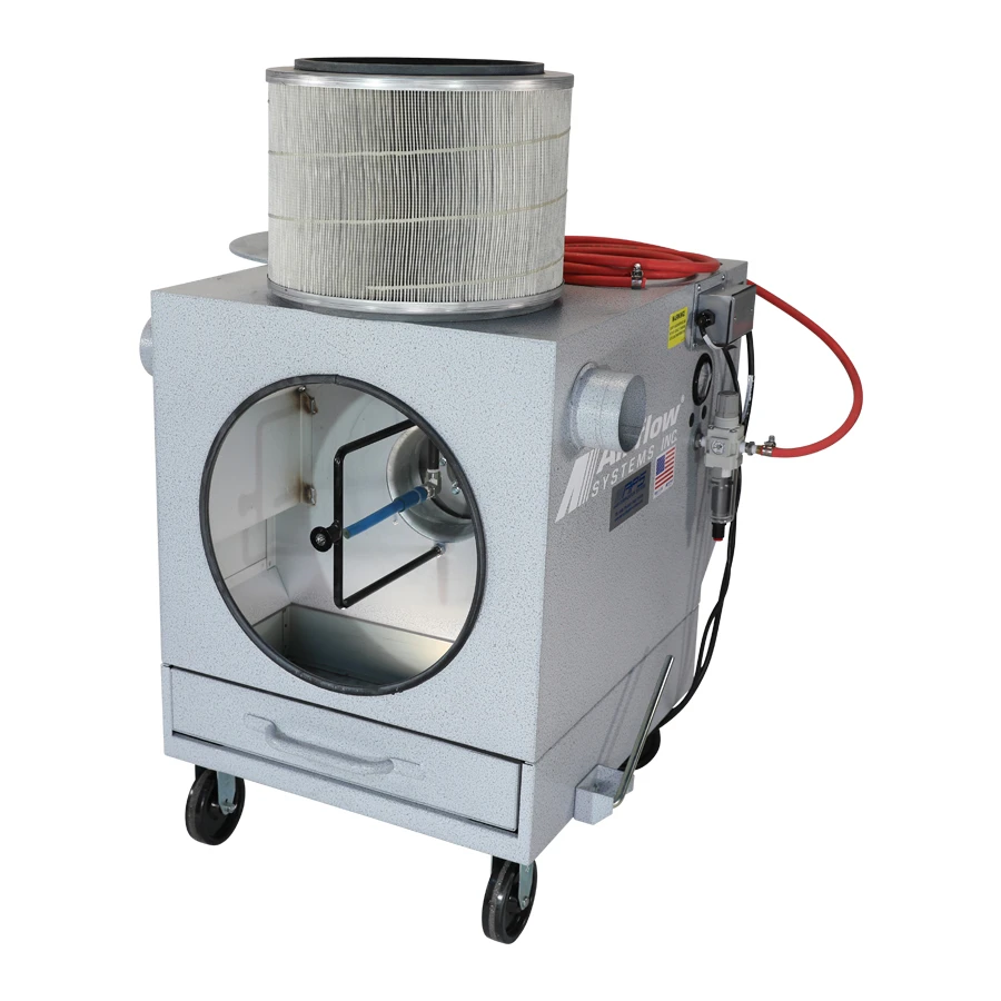 The Dust Filtration design is both powerful and smart. The 226sq ft of filtration is designed to operate two 2636VXA Sandcarving Systems at once. The built-in suction dampener will adjust the system’s internal airflow. The Dust Collector is equipped with an airflow meter which monitors differential pressure between the clean and recirculated air. Once the airflow meter measures a decrease in air pressure, the automatic air pulse cleaning function injects 100psi of stored air into the cartridge filter, providing clean airflow into the 2636VXA Sandcarving System.