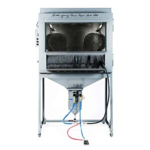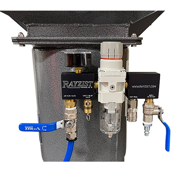 This exclusive, built-on dust filtration system incorporates a mechanical shaker to protect you from exposure to airborne dust while you are sandcarving, and even during maintenance dust removal. The dust filtration system efficiently separates the worn abrasive using eleven woven polyester, HEPA filtration Teflon bags. The unusable abrasive is then emptied into the clear disposable liner.