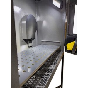 The blasting shelf can be adjusted to accommodate different-sized projects. This multiple level adjustable shelf is perfect for heavy glass projects.