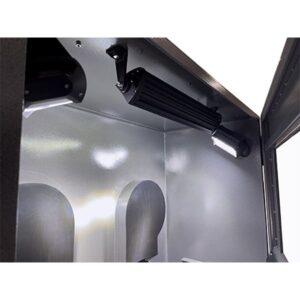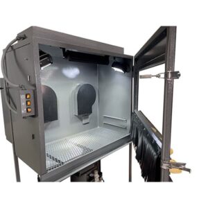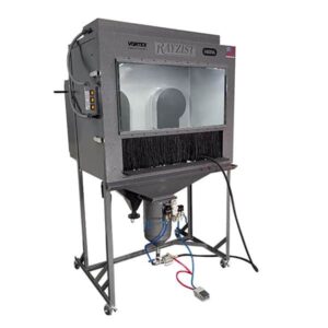 Building on the Rayzist tradition, the 2648VX Sandcarving System is artfully engineered for commercial production sandcarving. This large blasting cabinet has a full front door that allows for larger projects to be easily placed and removed. The cabinet also has a unique design for the blasting slot. There are no arm holes on this system. A blasting slot allows for extraordinary range of movement. This system is loaded with features such as a huge viewing window and stellar lighting provides optimal vision and performance. The inside of the cabinet is lined with neoprene to protect your glass and create an enhanced contrast of your etching. The large workspace, unique front door and controlled lighting are features that are highly desired by glass artists.