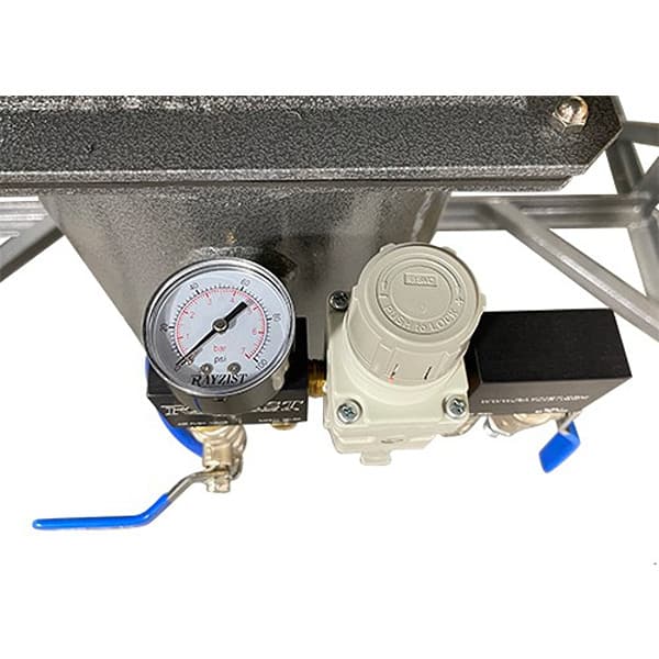 This unit regulates the amount of air pressure and sand flow (PSI) being sent to your blasting hose/nozzle and efficiently separates the water content. We have combined the two functions into one unit to minimize space. Standard features include an auto-relieving moisture drain to remove water drops and oil from compressed air, a push-down locking adjustment knob to change pressure settings, pressure gauge, liquid level indicator and manual relieving valve.
