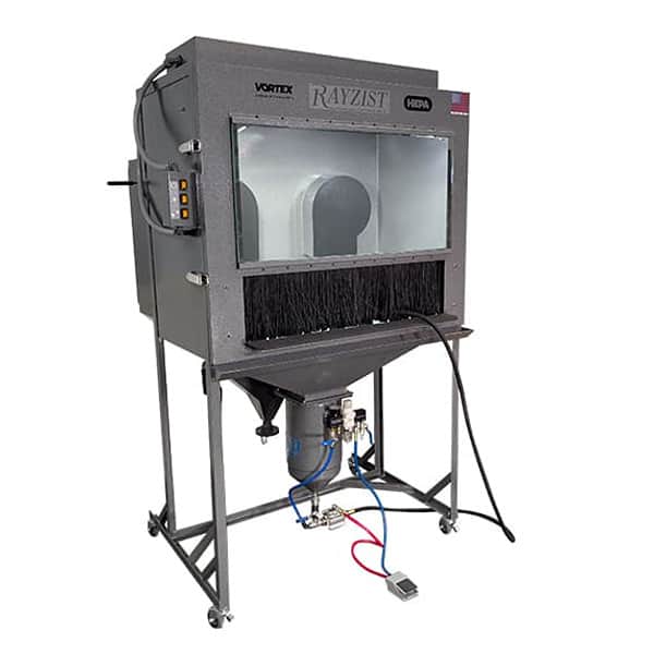 During blasting, Vortex sends the abrasive into an airwash, which automatically filters the finest dust particles and debris from the usable abrasive. The dust and debris are directed into the HEPA filtration system, ultimately ending up in the disposable liner; the usable abrasive is redirected back into your system for reuse.