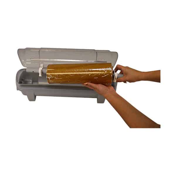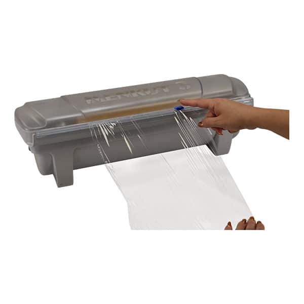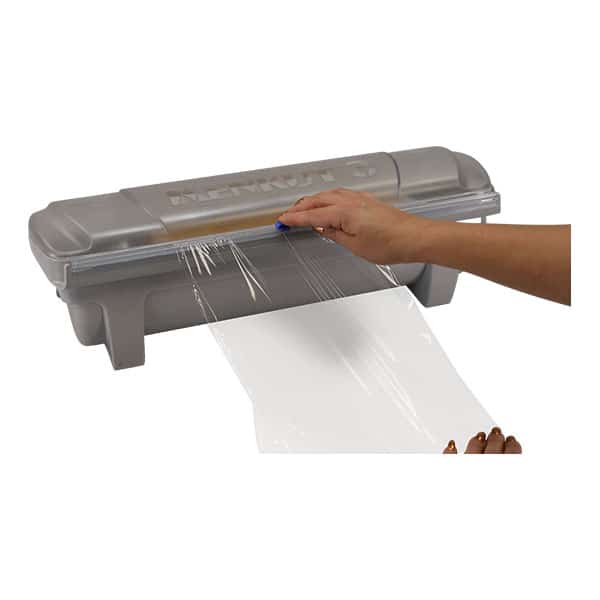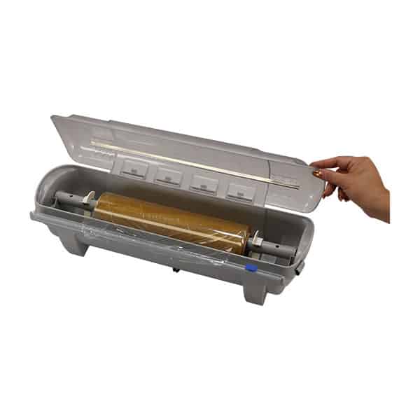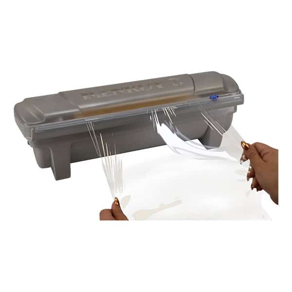 Easily cut blast plastic wrap film with this dispenser and cutter. To ensure a user-friendly experience, the lid stays open on its own and includes integrated blade storage for 2 replacement blades (sold separately). In addition, its functional design will help save you money and time by reducing waste due to tangled rolls.